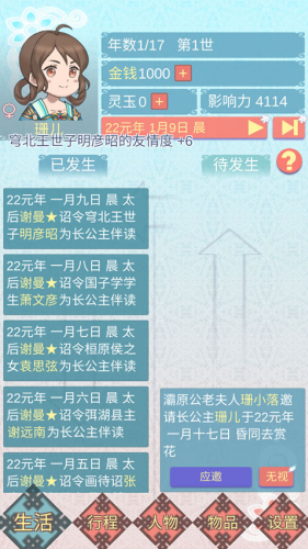 5、然后就会自动开始剧情故事了,左侧是已发生的事件,右侧是待发生的随机事件,需要自由做出选择,不同选择会对未来的命运产生不同的影响。