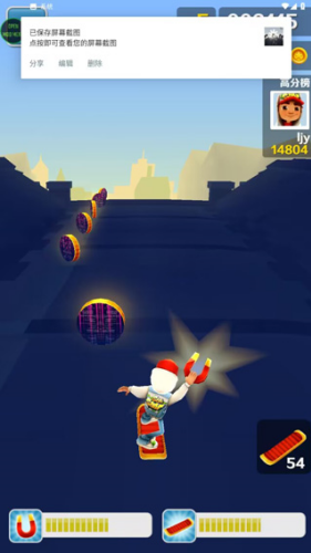 4、铁跑酷中有磁铁、飞行背包、双倍得分、运动鞋、滑板等道具。