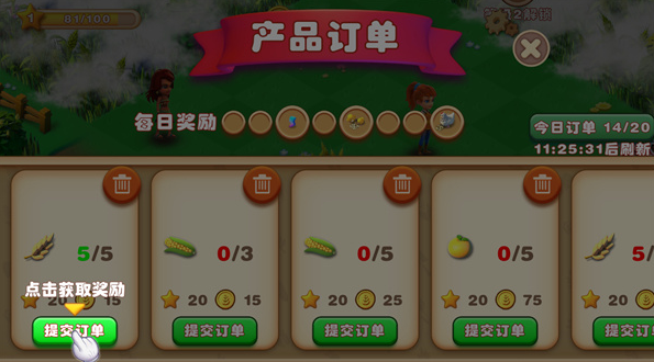 5、收集农产品并完成订单能够让你获得更多金币去购买更多道具,或者获得升级所需的经验值。