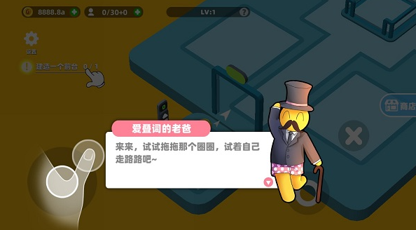 点击右侧图中的圆圈即可建造各种设施,比如任务引导下的建造前台。