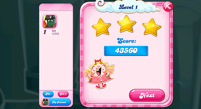 玩家必须在有限的次数下,达到规定的分数才能过关,若积分达到或突破了规定的上限,就可取得三颗星的成就。在该关卡下,想要获得高分必须在最少的步数消除最多的糖果,优先选择组合出特殊糖果。