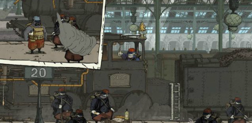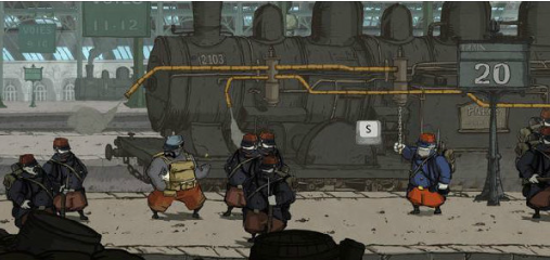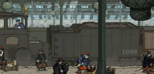 4、下一个场景我们的目标是要登上列车之上,但是梯子有士兵阻挡,在这名士兵旁边有一个军乐队,按照“2-4-3-1”的顺序与乐手对话,士兵就会自行离开【收集品5】,最后在车顶之上往左走,拉动另外一个链条机关赶走另外两名士兵即可。