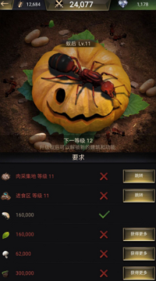 蚁巢地区限制条件:想要探索除去自己等级之外的更多蚁巢位置,就必须将蚁后的等级提升,而蚁后想要提升等级,就转化成了各种资源的获取以及仓库储存限制。这两个条件是相互转换的,说白了,想解锁更多的区域,你就得有这么多的物资。而新手引导结束之后,玩家们的主要目标也应该变成想法提高蚁后的等级,这样主要任务就转化成为尽可能多的在游戏中获取肉,水,植物,沙子,蜜露等种种资源。