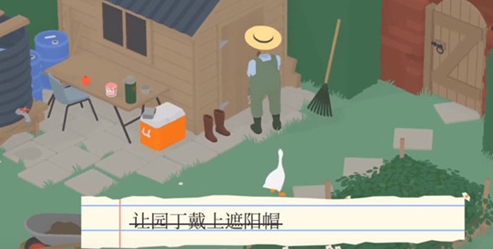 4、等园丁找不到帽子回去的时候,我们也跟着一起回去,跟着园丁我们可以看到园丁到后面房子的门上拿起了遮阳帽戴,完成【让园丁带上遮阳帽】。