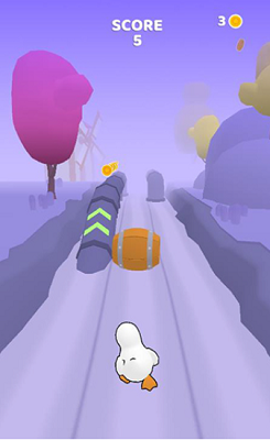 2、游戏的玩法其实很简单,就是经典的跑酷玩法,通过上下左右滑动屏幕控制鸭子跑酷,比如遇到这种障碍物就向下滑动;