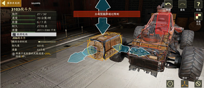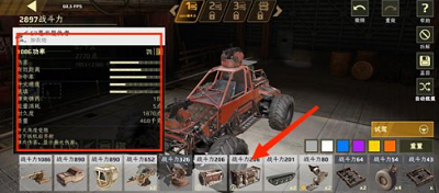 玩家在改装页面改装战车,左上角是你选择的配件的相关数值,下面是你可用的配件和配件的战斗力,通过合理搭配打造出你的最强战车