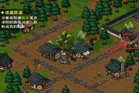 一、首先玩家启动烟雨江湖手游。接着返回新手村,到达图中位置。然后去图中npc对话。之后就能获得独孤九剑。
