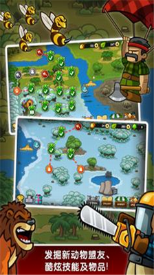 森林防御战猴子传奇中文版破解版是一款策略塔防游戏,游戏以森林作战为背景,玩家不仅要控制自己的猴子部队进行战斗,还有注意随时出没的伐木人,阻止他们对森林造成伤害,带领自己的部队完成一场场家园保卫战。游戏采用了卡通的画面设计,加上对推式塔防的玩法,让玩家可以轻松进行操作,而且游戏还为玩家准备许多道具,玩家可以在关键的时刻使用道具,帮助自己拯救森林。森林防御战猴子传奇游戏里面有着非常丰富的动物种类,包括狮子、猩猩、老虎、犀牛、小鹿等等。我们可以派遣他们去与拿着斧子、电锯以及驾驶着伐木机的人类进行战斗,感受超精彩的塔防游戏体验。六蓝游戏网为您分享森林防御战手游下载中文版,推荐喜欢塔防游戏的朋友们下载体验哦!