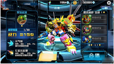 现在游戏中提供的合体机甲共有4款,分别是来自《果宝特攻》世界的果宝战神、《快乐酷宝》世界的雷霆战宝、《钢铁飞龙》世界的巨龙六合体、《超兽武装》世界的超兽神合体。