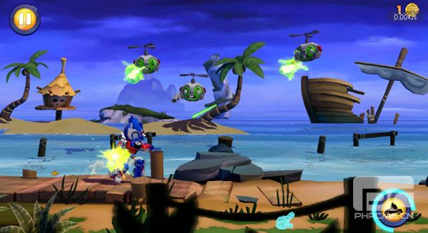 随着关卡的增加,之后不仅仅只有海面上的敌人,空中也会有敌人肆虐。绿猪驾驶直升机会攻击变形金刚,这个时候需要随时注意直升机的位置,在射击的时候,直升机还会躲避,所以玩家需要快速反应,尽快击杀。