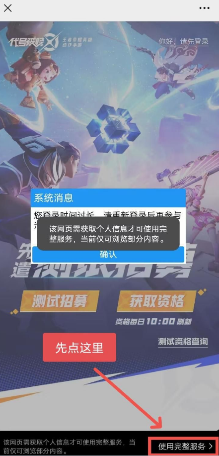 在微信中登录时会提示“您登录时间过长,请重新登录后再参与活动”此时直接点击确认的话会提示“该网页需获取个人信息才可使用完整服务,当前仅可浏览部分内容。”需要点击右下角的【使用完整服务】后才可正常登录,如下图所示