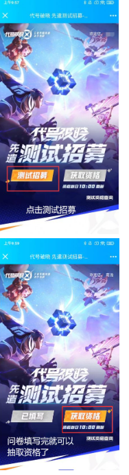 在QQ/微信打开的招募活动页面中点击【测试招募】按钮填写问卷,然后点击【获取资格】按钮即可抽取测试资格啦~之前已经填写过问卷的小伙伴们可以直接进行资格抽取,资格每天都可以抽取,祝大家好运!