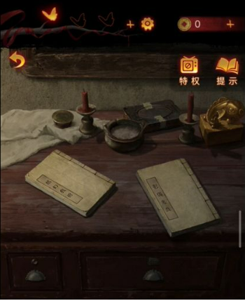 3、把木偶头放到神龛,近距离观察报纸,选择书本下的抽屉解开铁钩,转到颜料桌获得画笔;