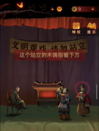 8、使用望远镜在观察戏台上,把葫芦放到中间小人位置,掉落木剑道具,然后把木剑在放到男童手中,获得蝴蝶板凳,把板凳放到戏台右边小人上,使用望远镜查看戏台处获得酒壶;