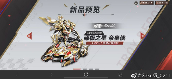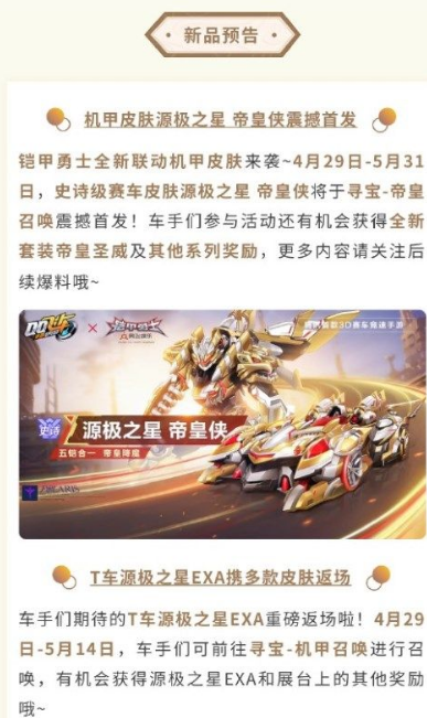 《QQ 飞车手游》宣布与铠甲勇士合作,史诗级赛车皮肤源极之星帝皇侠将于 4 月 29 日-5 月 31 日推出,官方还放出了首段 CG。玩家参与活动还有机会获得全新套装帝皇圣威及其他系列奖励。