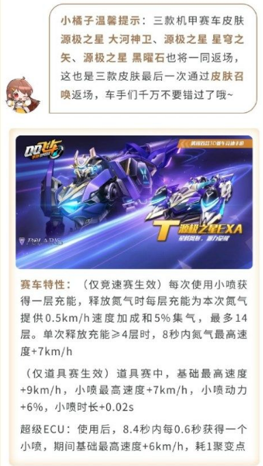 从官方活动获取到,《QQ 飞车手游》将在 4 月 25 日开启全新特洛伊熔炉盛典主题版本,多款皮肤在 4 月 29 日-5 月 14 日返场,包括 T 车源极之星 EXA、源极之星 大河神卫、源极之星 星穹之矢、源极之星 黑曜石。