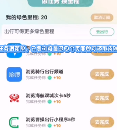 玩家进入到活动页之后可以看到攒里程的选项,点击进入之后完成指定浏览、绿色出行等任务,获得绿色里程。