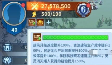 为帮助领主们更好适应战场环境,新赛季开启后,我们将为所有领主提供加速buff。其中包含:建筑升级速度提升100%,资源建筑生产效率提升100%,民居金币产出效率提升100%,资源点采集效率提升100%,学院科技研发速度提升50%,英灵消灭矮人获得的经验提升150%。