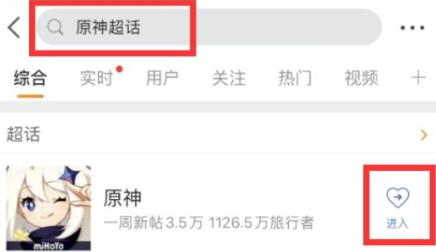 1、打开微博app,在搜索栏中搜索“原神超话”, 随后点击进入超话。