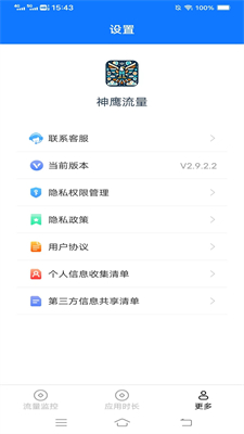 神鹰流量官网app最新版是一款具备独特移动流量手机监控管理服务应用软件,大家能够轻松进行个人手机移动流量套餐设定,具备便捷应用流量使用时长详情统计查看,在此具备流量监控数据列表查看简单整洁,更多不错流量合理每月规划使用能够有效方式用户流量超用,更多便捷优质流量手机数据管理方式开启使用,满足不同用户的管理需求,带来了更多的优质服务,根据月流量套餐进行每日的合理规划使用,避免流量超额现象,设置每日使用上限,使用完自动关闭流量数据,十分的便捷化。