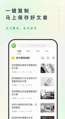 1、极速收藏:独创手机摘手工具,一经开启,即可以一键保存微信、浏览器里的精彩文章。