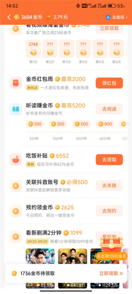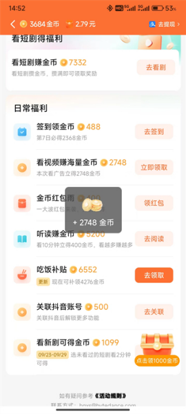 7、将屏幕向下滑动可以看到各种任务来获得金币。